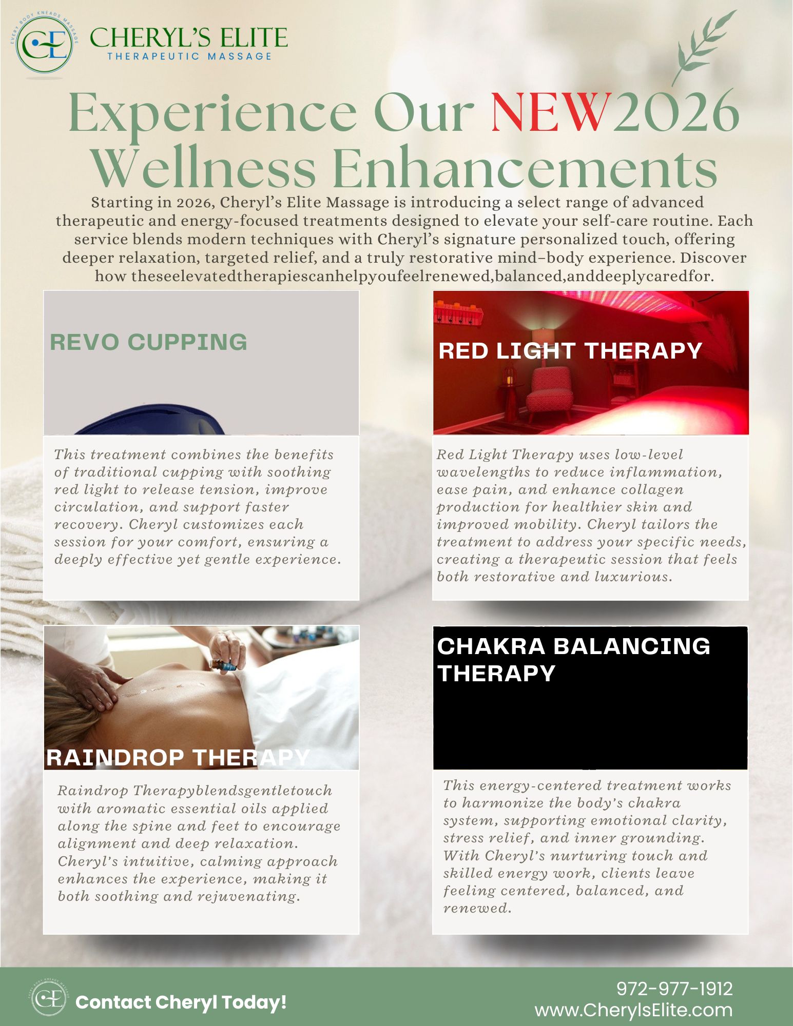 Experience serenity like never before. At Cheryl’s Elite Therapeutic Massage, each session is carefully crafted to melt away stress, ease muscle tension, and restore your inner calm from the very first moment.